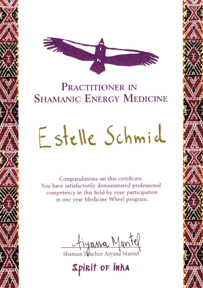 Diplôme de "Spirit of Inka" comme Praticienne en médecine énergétique chamanique.